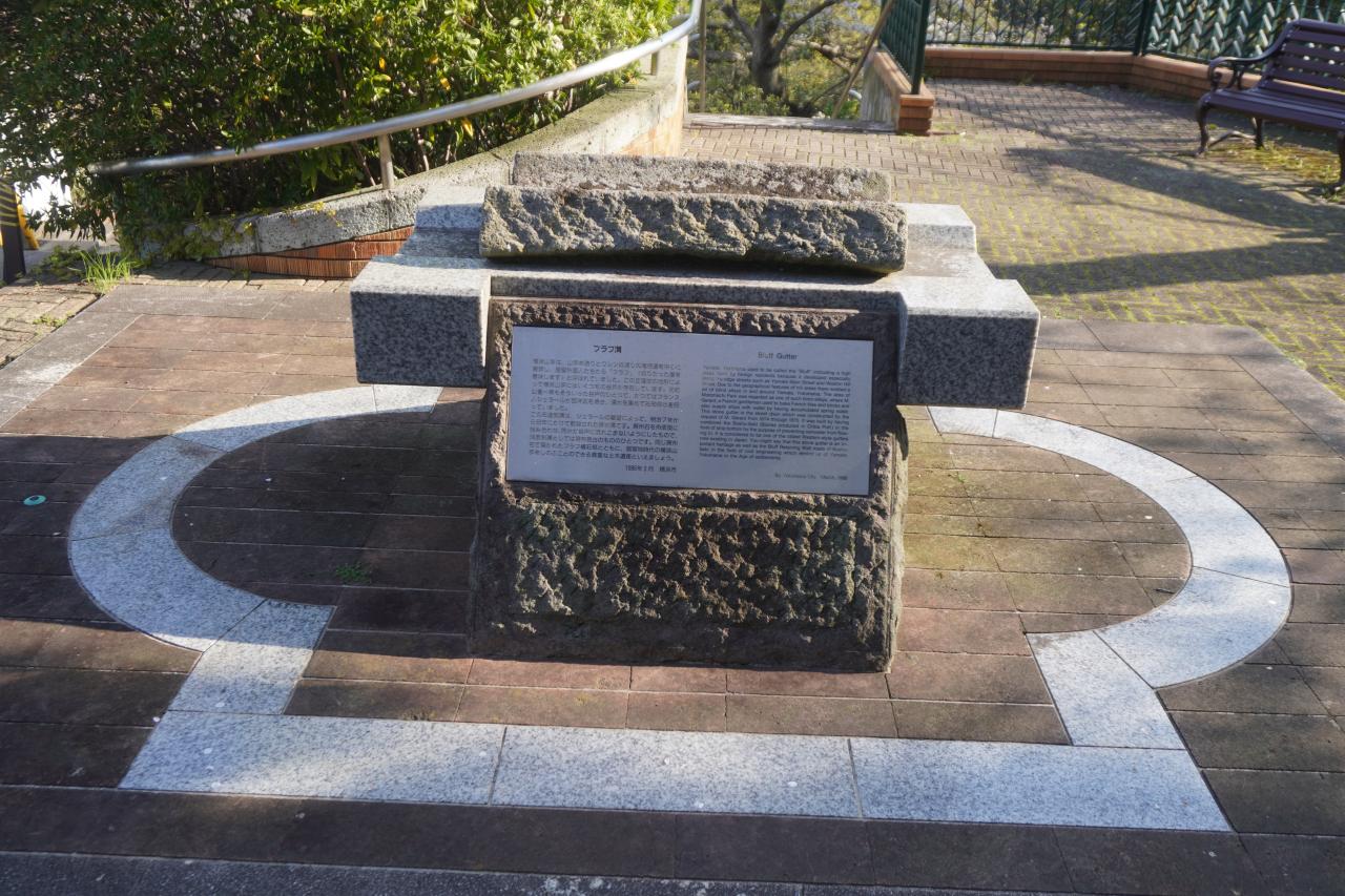元町公園の一角に保存されているブラフ溝。明治7年から翌年に敷設された石造りの道路の側溝(排水溝)で、この辺りで煉瓦工場や船舶給水事業を行っていたジェラールの要望によって作られたそうです。使われた船底型の房州石が置かれていますが、あんまりイメージは湧かないかもしれません。