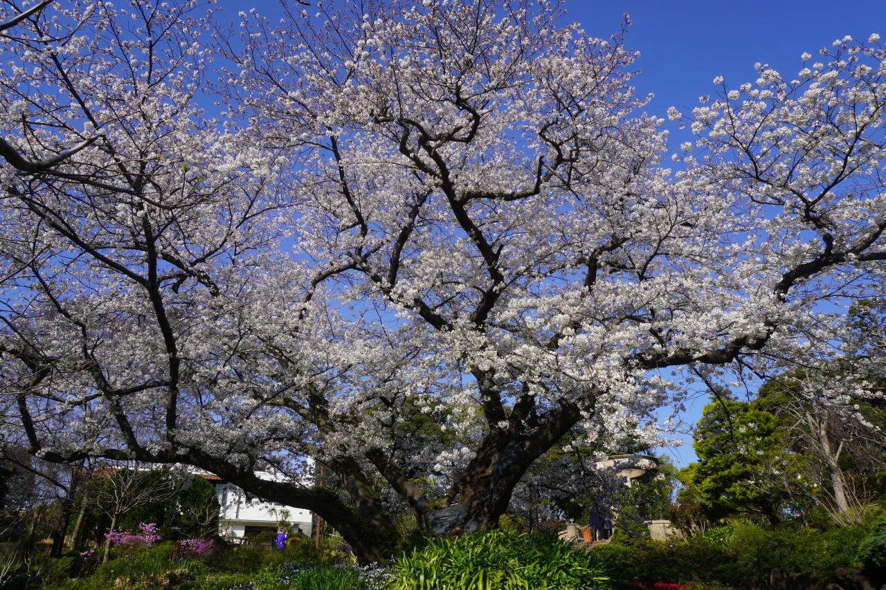 ここから新山下運河の霞橋を目指しますが、神奈川近代文学館のところで見事な桜の木に出会いました。まさに満開。しばし見とれてしまいました。