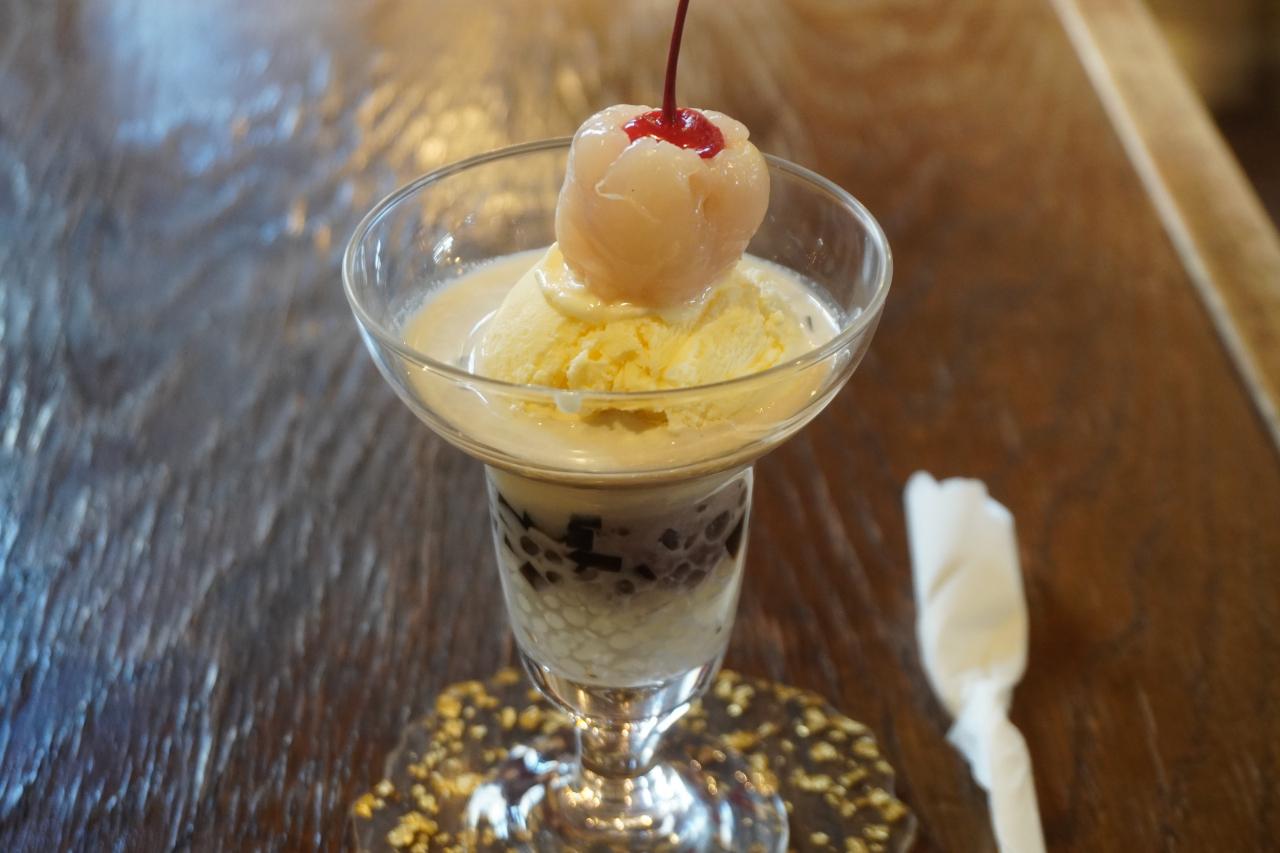 敦煌パフェ750円をいただきました。すっきりしたバニラアイスにライチやなにかの薬草のジュレとかが組み合わさって、複雑で奥深い玄妙な味わい。とにかくすごくおいしいです。特別な材料は使っていないみたいですが、この味を良しとして作りだすそのセンスはたぶん中華の達人だから。おいしいのツボをよく心得ているのだと思います。