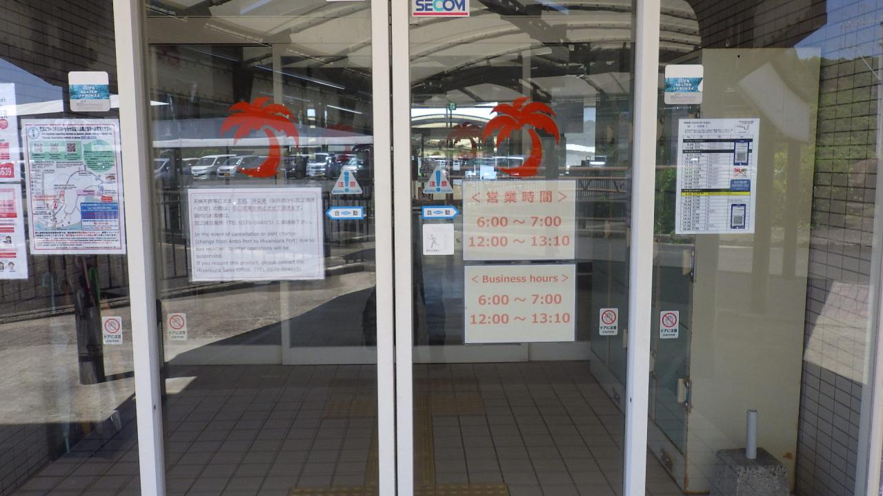 ショックな貼り紙「営業時間6:00~7:00、12:00~13:00」が貼ってあった。自動ドアの向こうにコインロッカーがあるので、自動ドアに近づいても開閉せず。安房港 乗り物