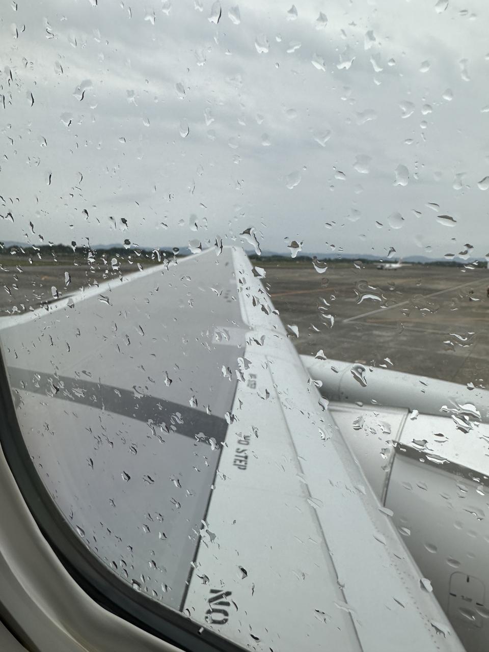 鹿児島空港離陸準備で滑走路に向かう。この日は、GWUターンラッシュの始まりで、東京・羽田管制より出発を28分遅らせた。この頃は、雨の鹿児島となる。鹿児島空港 空港