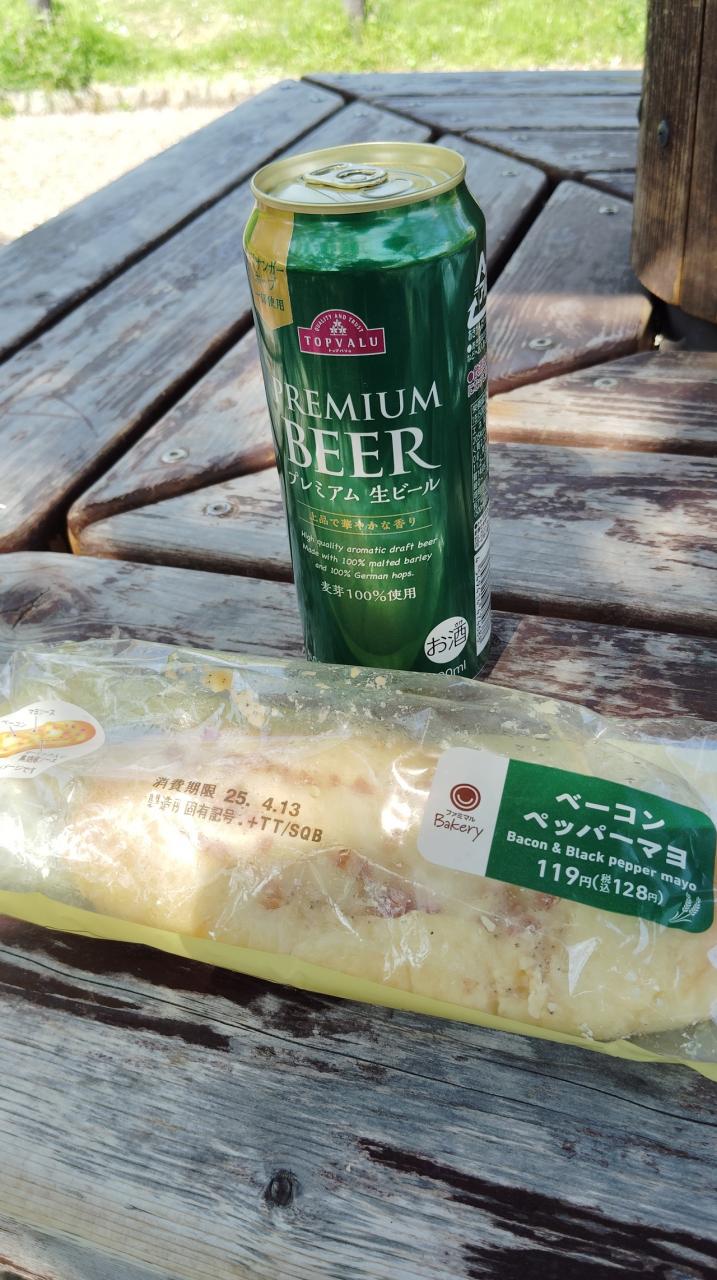 ウエルシアで買ったビールと、朝、コンビニで買ったパンをいただきます!
