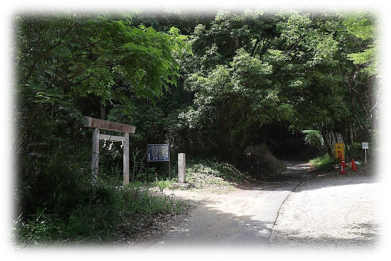 鳥居の先右手に自然石の常夜灯があり、先は登山道のような参道が奥に続いています。