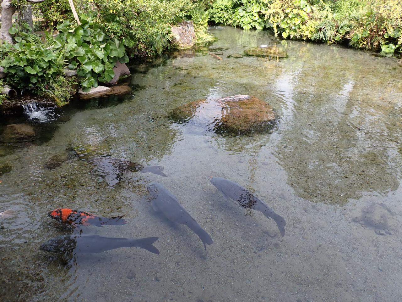 建物の縁側が池の上までせり出していて、澄んだ水の中を泳ぐ大きな鯉をすぐ眼下に眺めることができます。豊富な湧水によって池の水は常に入れ替わり、台風が来たりしても決して濁ることはないそうです。