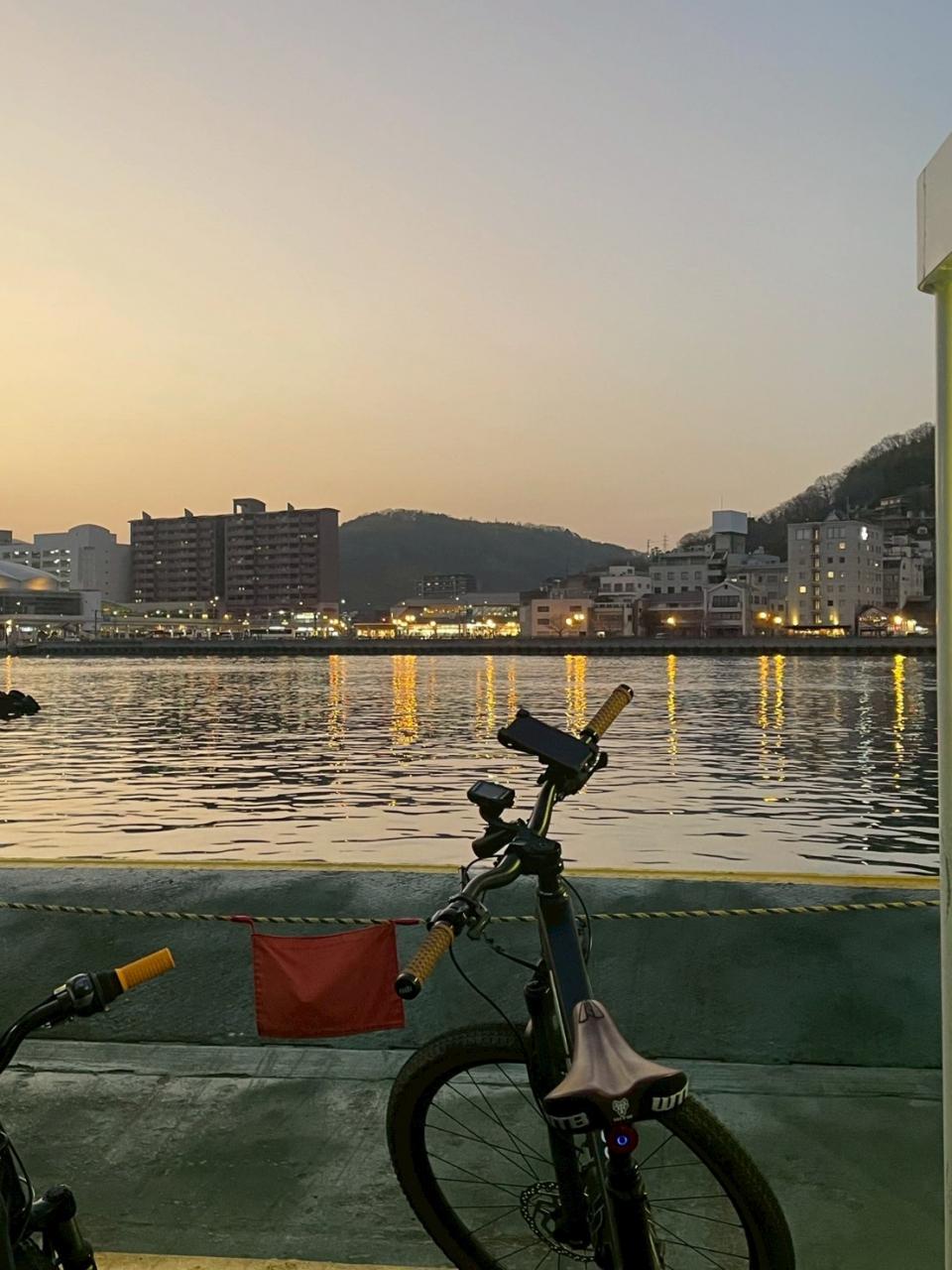母だけ、瀬戸田港からフェリーで帰る(3500円)ことは許されず、みんなで、因島重井港からフェリーで帰ろうとなりました。16:49間に合わない可能性がある中、みんなでダッシュ。息も絶え絶えで10分強過ぎて到着したところ、因島重井港はヒト月前から桟橋が損傷し乗船中止と。しばらく呆然となりましたが、お菓子ジュースで復活させ、夕焼けを気持ちよく走りました。