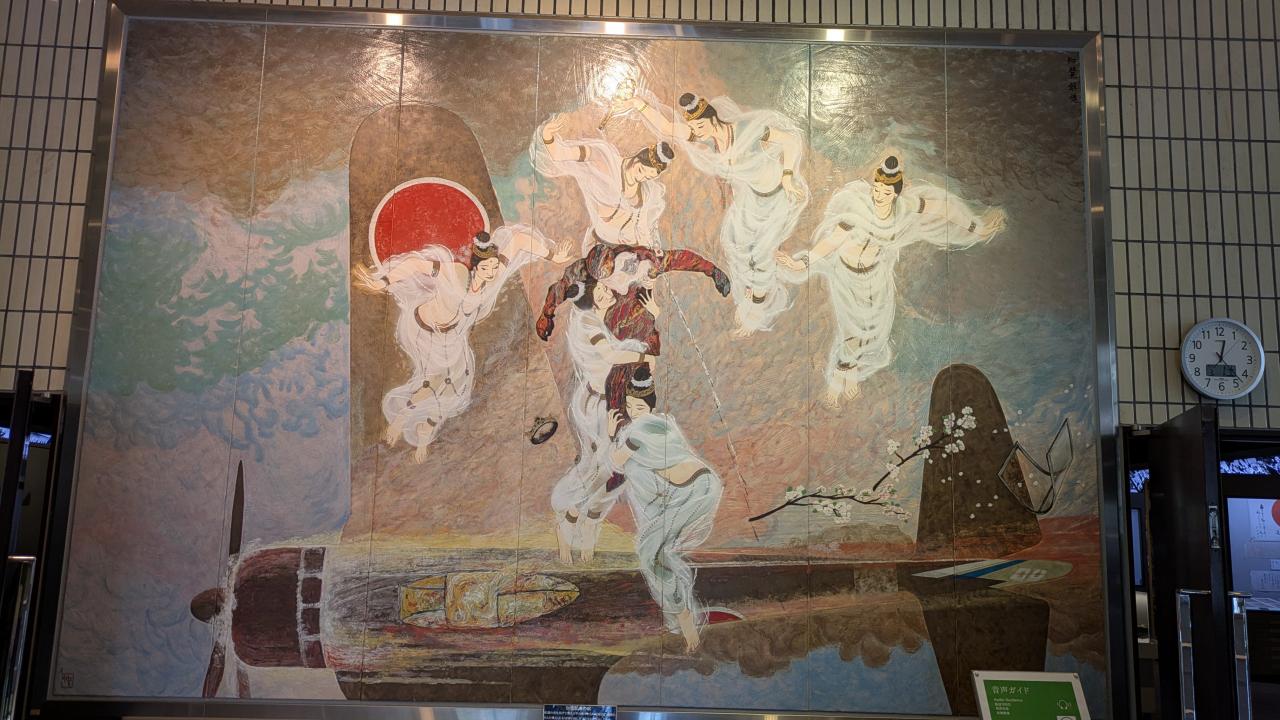 燃えるゼロ戦から6人の天女が、兵隊の魂を天に連れて行く姿を描いているとのこと。