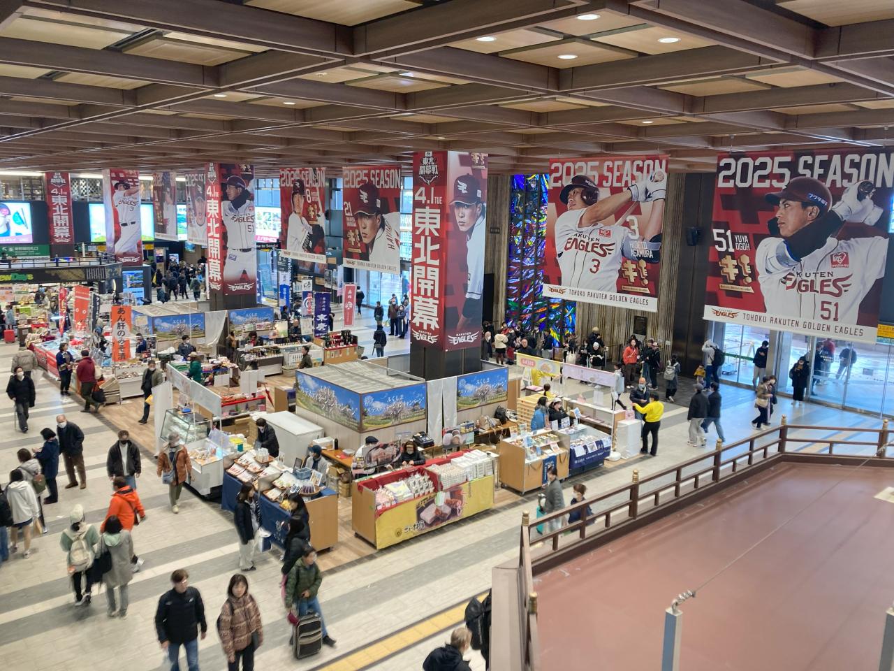 仙台駅のコンコースには、「楽天イーグルス 2025東北開幕」の垂れ幕がたくさん掛かっていた。