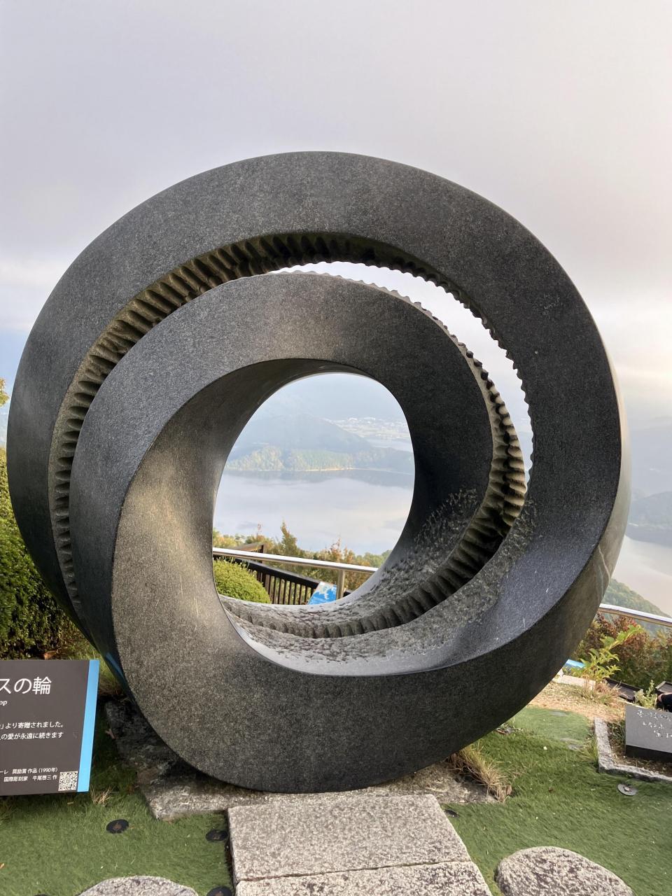 メヴィウスの輪という、輪の中心から五湖テラスのソファーと、三方五湖の景色が楽しめるスポットで、恋人の聖地にあやかり、無限に続くメヴィウスの輪のように