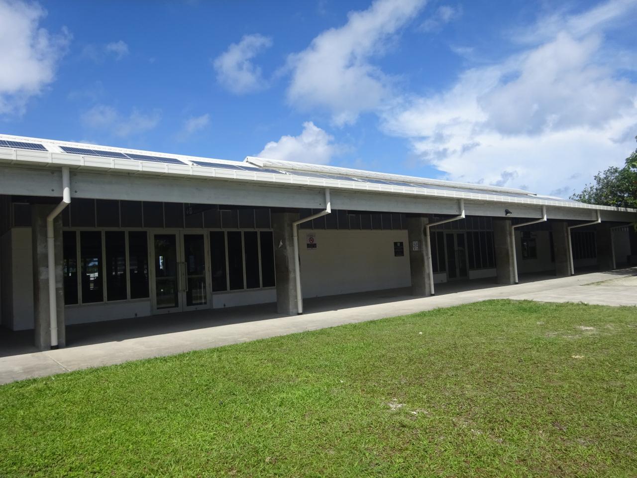 1)バイアク地区散策①(12:35-13:07)ツバル国立銀行 テレコム 政府庁舎 政府関係のマネアバ パートナーシップセンター(会合中) 図書館 郵便局と南に歩き、今度は北上します。 Hを通り過ぎ ヌクラエラエ島のマネアバ SevenDaysChurchを見て