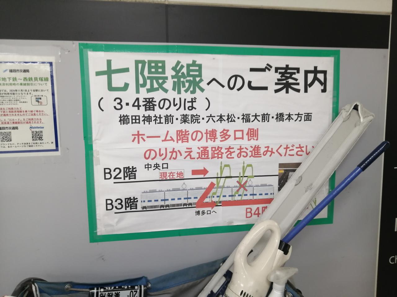 博多駅から地下鉄七隈線に乗り換えますが乗り換え場所が分からず少しウロウロして駅員さんに聞いて移動しました。博多駅に到着したら床に行き先に矢印があるのでそれを見ながら進むと分かりやすかったかも。 -