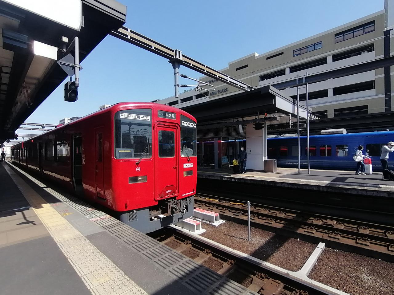 赤い電車が来ました。以前大分駅構内で見かけた電車です。 -