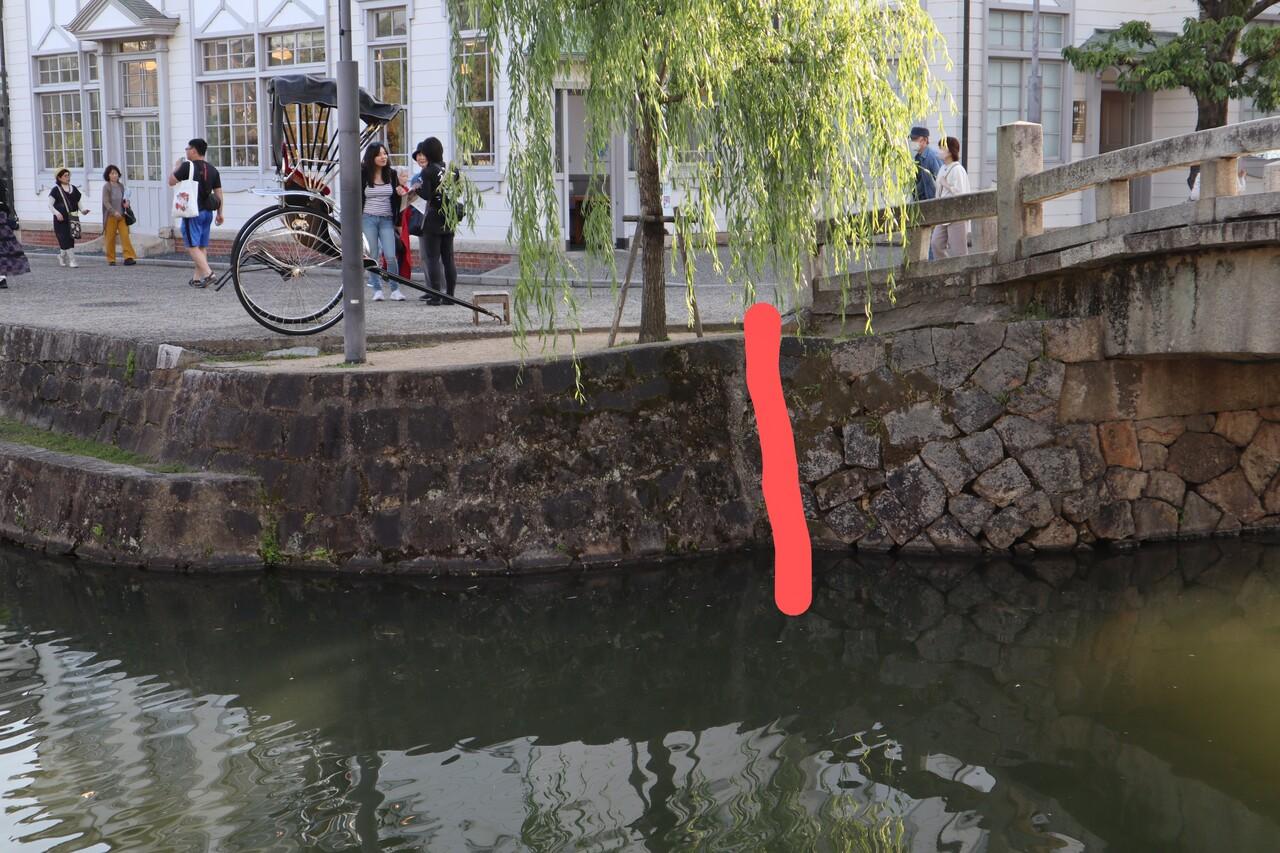 赤線の左と右で石の積み方が違うと思いますが、左側の方は川を埋め立てた部分だそうです。昔は埋め立てた部分まで川幅が広かったそう。このようなお話も船頭さんから聞くことができました。