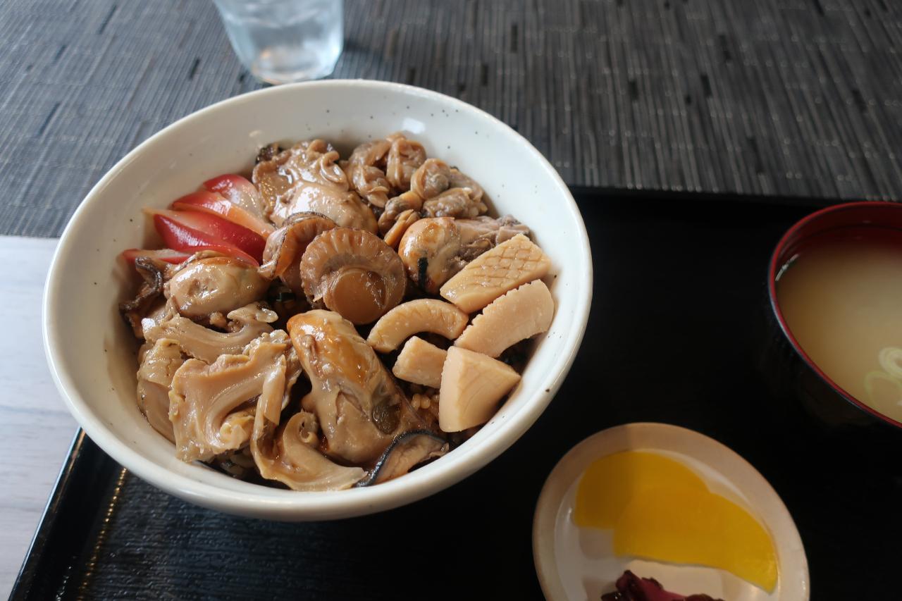 地元のカキ、アサリ、ホタテ、イカがたっぷりのった一福丼、1200円。充実した内余でとても満足。