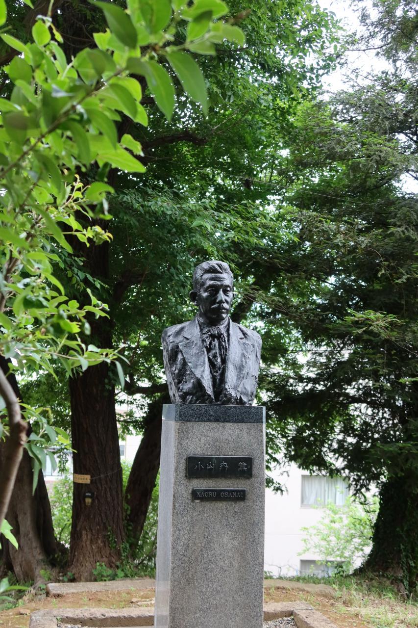 文学の丘、最奥にあるのが小山内薫の胸像。「新劇の父」と呼ばれた人で、胸像は早稲田の大隈重信像を作成した朝倉文夫作です