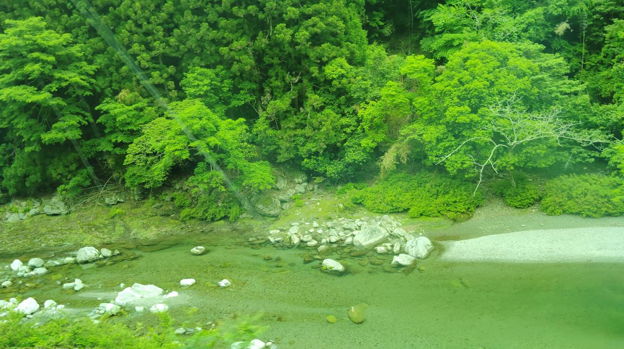 行きのバスは窓際でなかったので写真が撮れなかったのですが、帰りは窓際に座りました。車窓から見える貞光川の流れがきれいだなぁと思っていたのです。