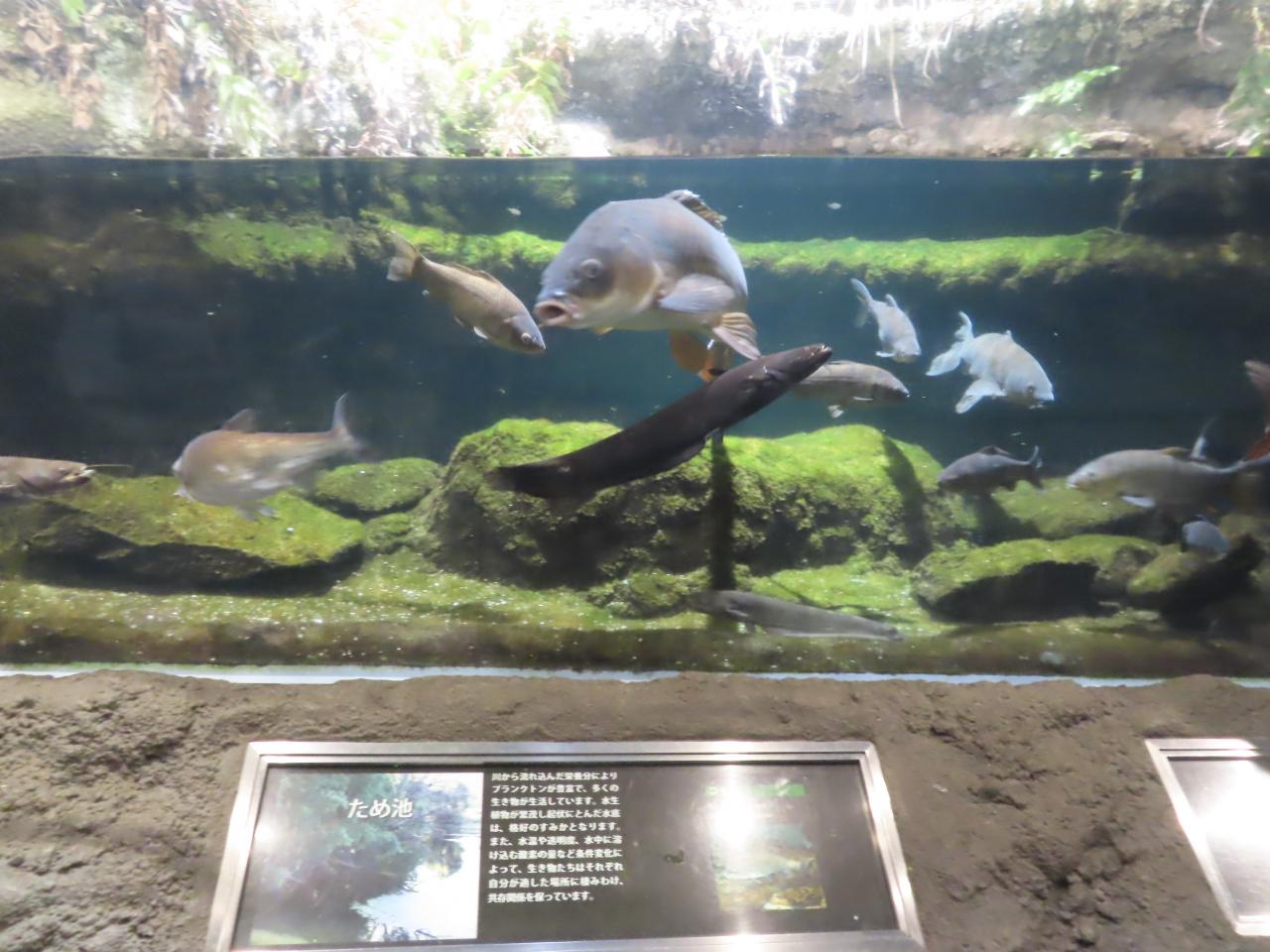 中に入ると、まず川から海までを模した水槽があり、魚の棲息を観察できるようになっている。