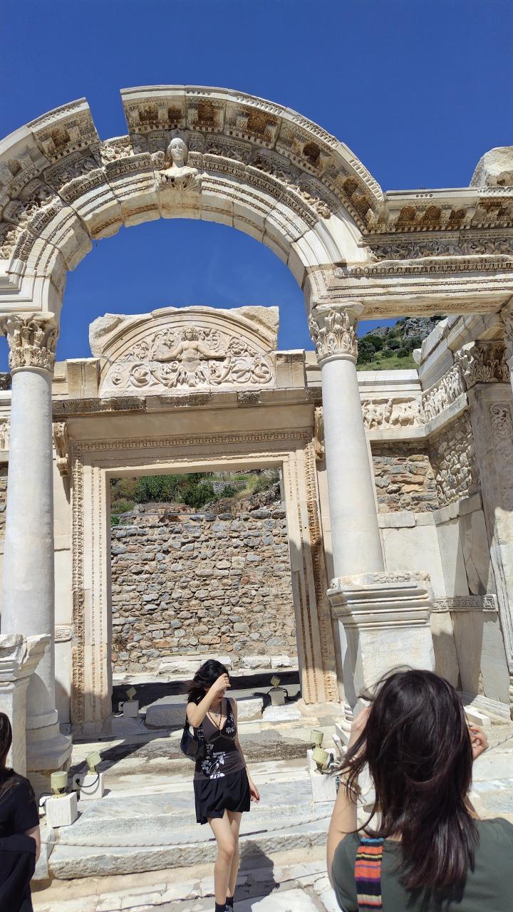 昼食後小一時間バス移動、エフェソス遺跡にやってきました。エフェソスはエーゲ海クルーズ客が訪れる屈指の観光場所。クルーズ客は午前中にやってくることが多いので、私達はその混雑を避け午後からの観光です。