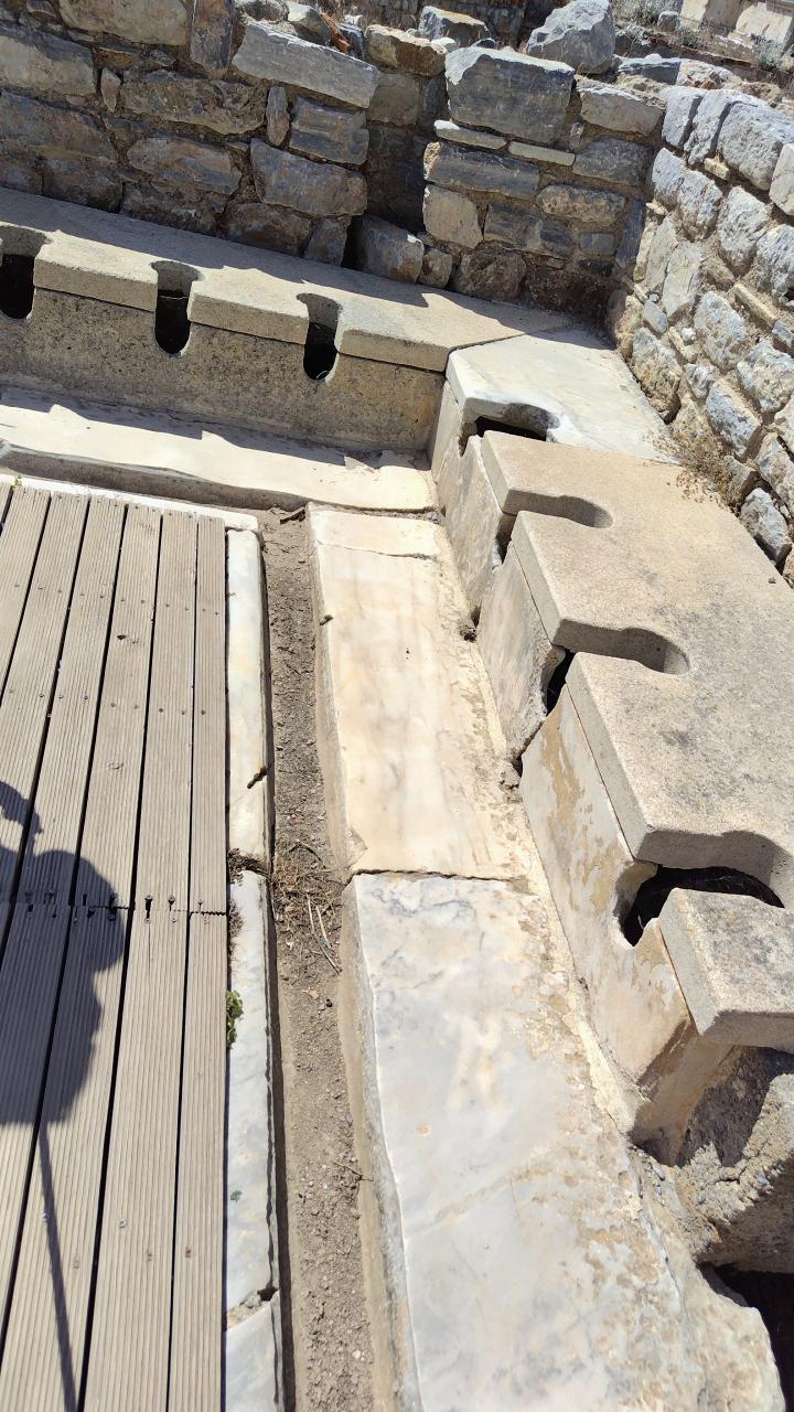 アーチをくぐって入って見ると、ずらっと並んだ公衆トイレ。下を水が流れている水洗式なんだそうです。やはり大理石。当時の衣装は長いローブだったので、トイレを使いながら、会話しながら、といった社交の場だったとか。もちろん男性専用。