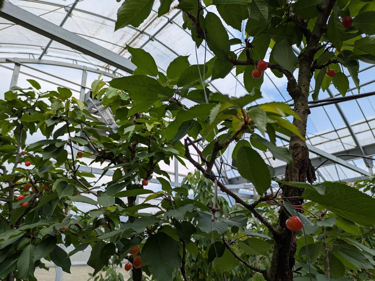 他のハウスで、実に袋のかかった木がさくらんぼ狩りを待ってました。