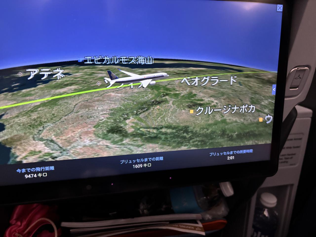 シンガポール⇒ブリュッセル間は、「プレミアム・エコノミー」を利用しました。女性軍は、窓際の2列席。私は、中央の3列席通路側を予約しました。