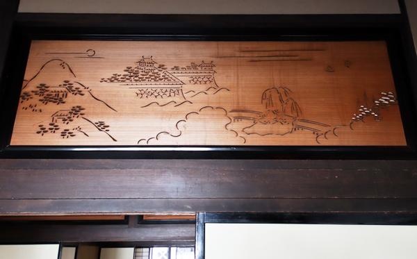 座敷の欄間を飾っているのは「近江八景透かし彫り」。