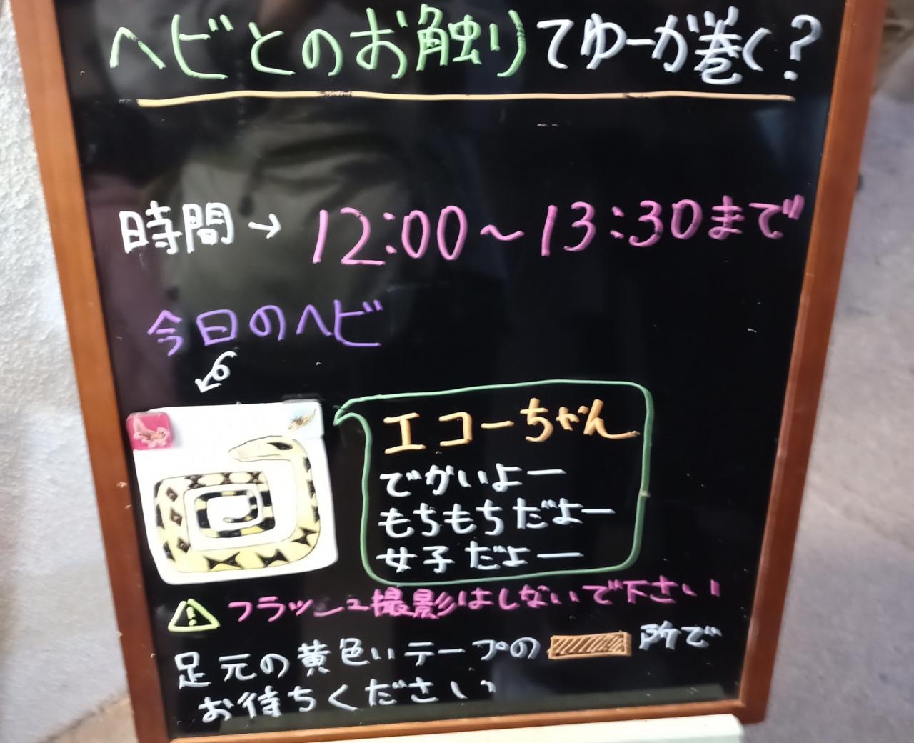 係りのお兄さんに首に長太い蛇を巻かれている・・・。ふれあいっていうか絞め殺し・・・無理無理。が、旦那さんがまさかの乗り気で、並んでいる人も少なくてすぐにエコーちゃんと触れ合いタイム突入