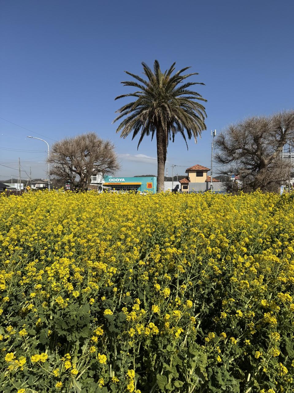 桜と菜の花のコラボは見ますが、菜の花と椰子の木のコラボは初めてです。 -