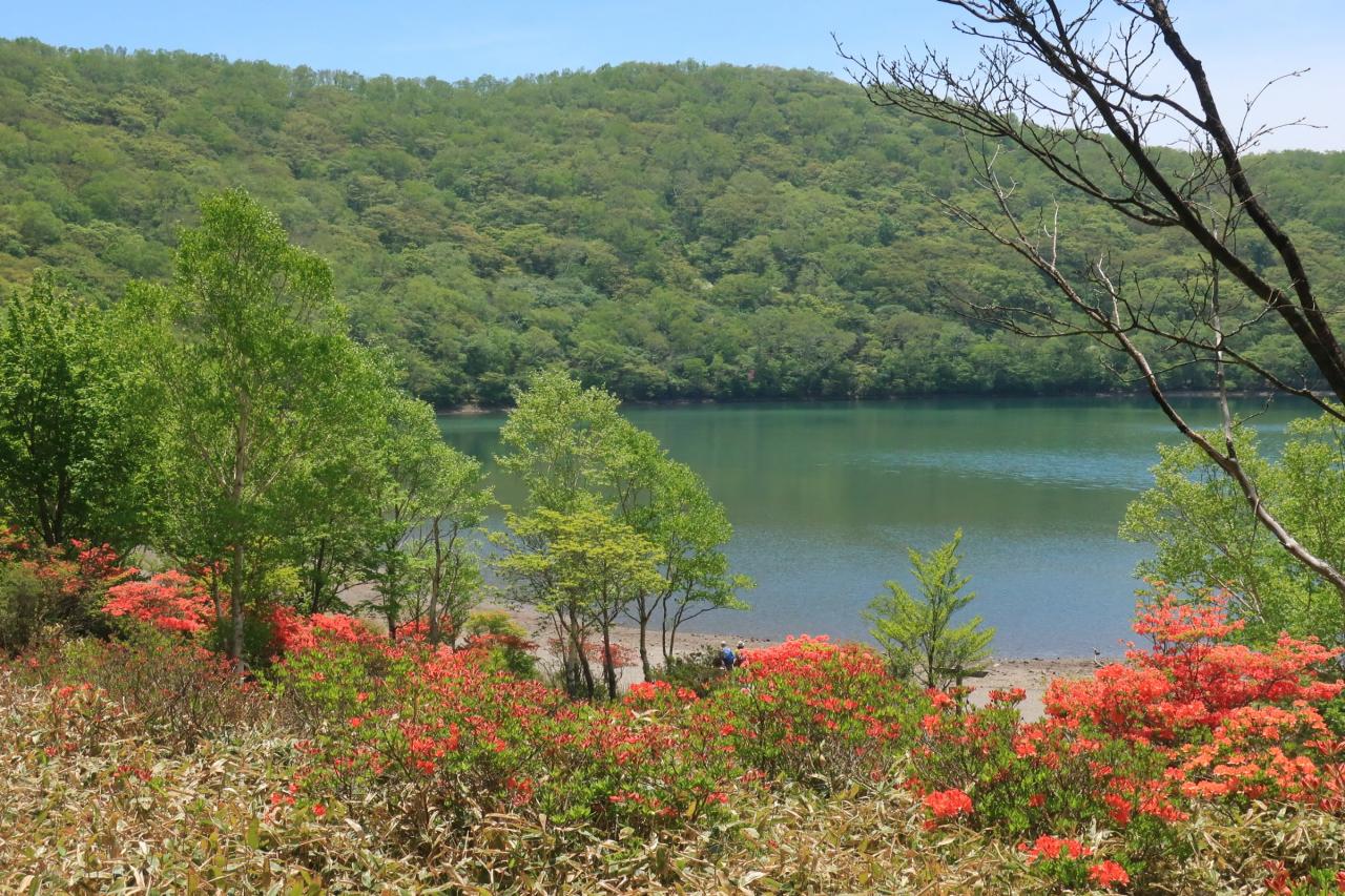 レンゲツツジ越しの覚満淵。対岸にはズミの花。