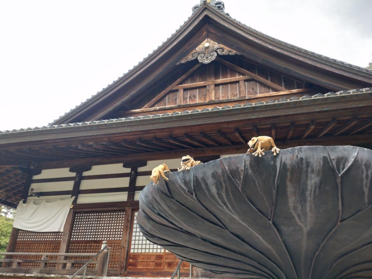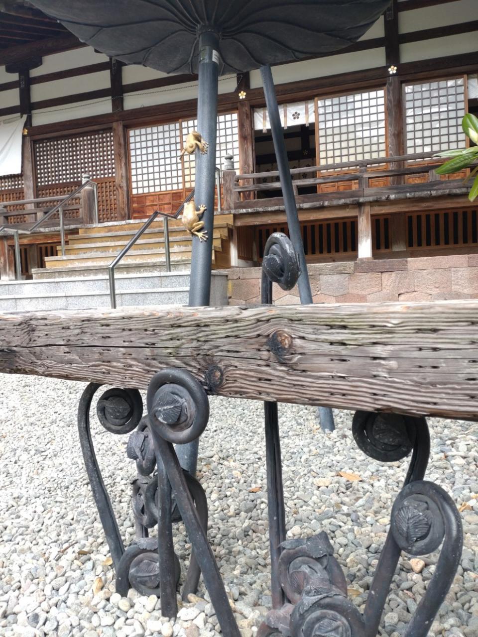 拝殿の横には蓮のふちに乗る金のカエルが。