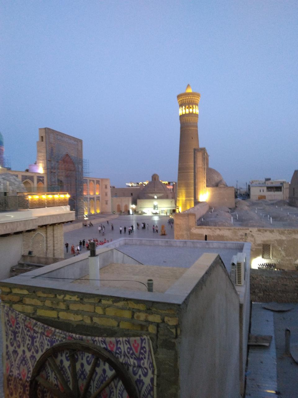 レストランは、ホテルから10分ほど歩いたところ、カラーン・ミナレットやカラーン・モスクを見渡せる、絶好の場所。3階のテラス席。ビュッフェで食べ放題。ドリンクは別。ビール500円。グラスワイン500円。