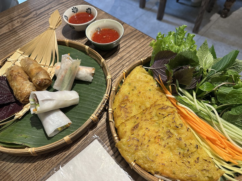 バインセオは生春巻きの皮みたいなのが付いてきて、店員さんが食べ方を教えてくれました。