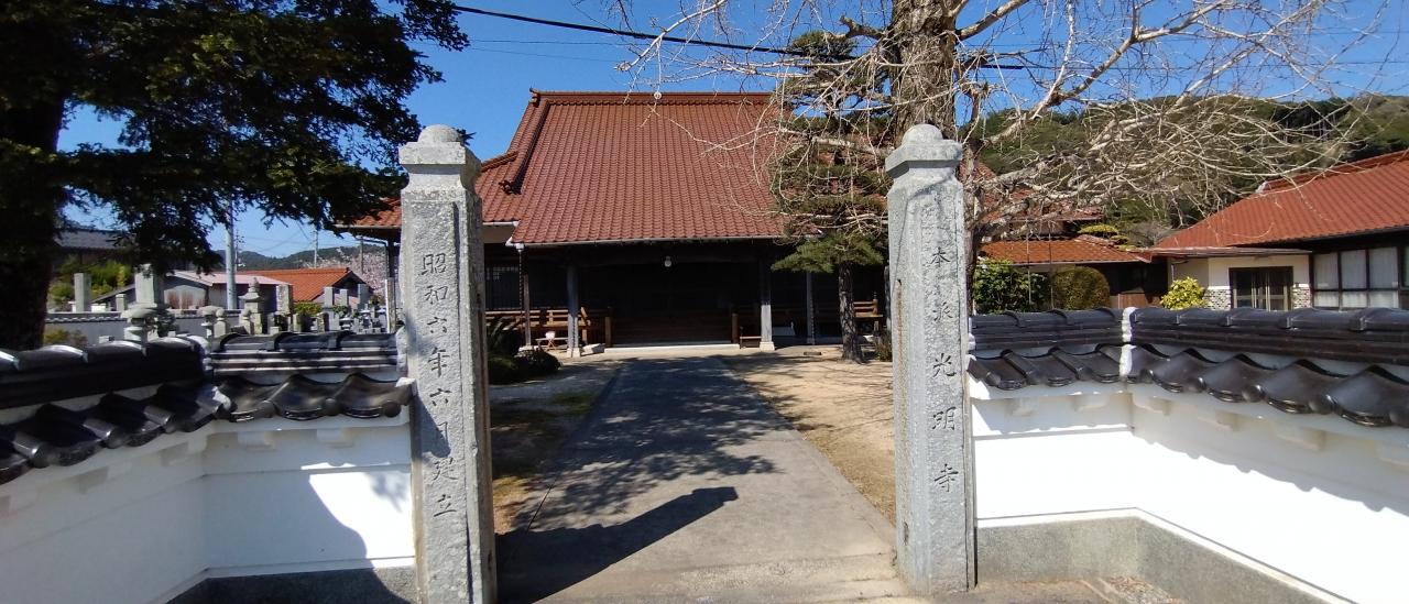光明寺は浄土真宗の寺。文明3年(1471)に開創。開祖は恵門、俗名は高橋光明で安芸国高田郡吉田の豪族の子。8世教如上人に仕え、後に諸国行脚と途上大田村の大野益吉にこわれ一宇を建立した。