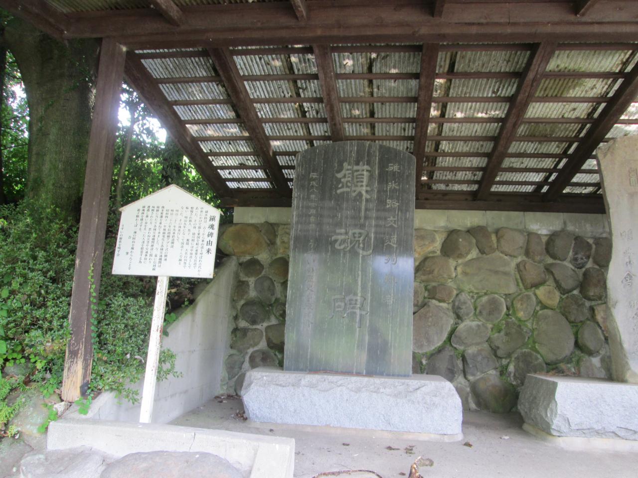 鎮魂碑 関所跡には鎮魂碑が建っています。古くは東山道、江戸時代には中山道、明治26年の信越線アプト式鉄道の開通、昭和38年新線開通等、交通手段の変遷がありました。交通機関開設や交通事故に遭遇等により尊い命を失った人々を慰霊するためにこの碑が建立される