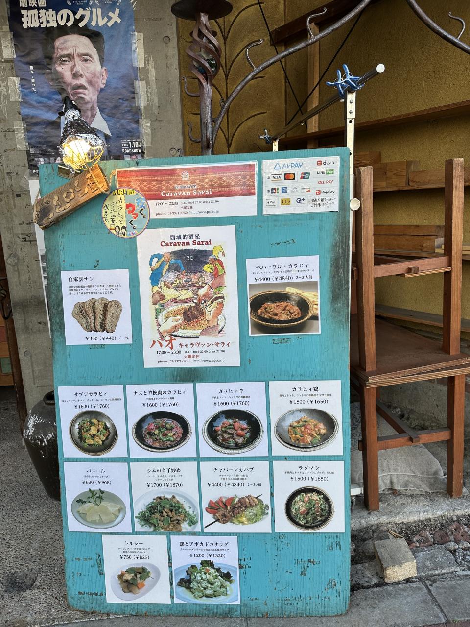お店の前にメニュー看板がありました。いろいろなアフガニスタン料理が楽しめそうです。看板の背面に「孤独のグルメ」ポスターがあります。キャラヴァンサライ包 グルメ・レストラン