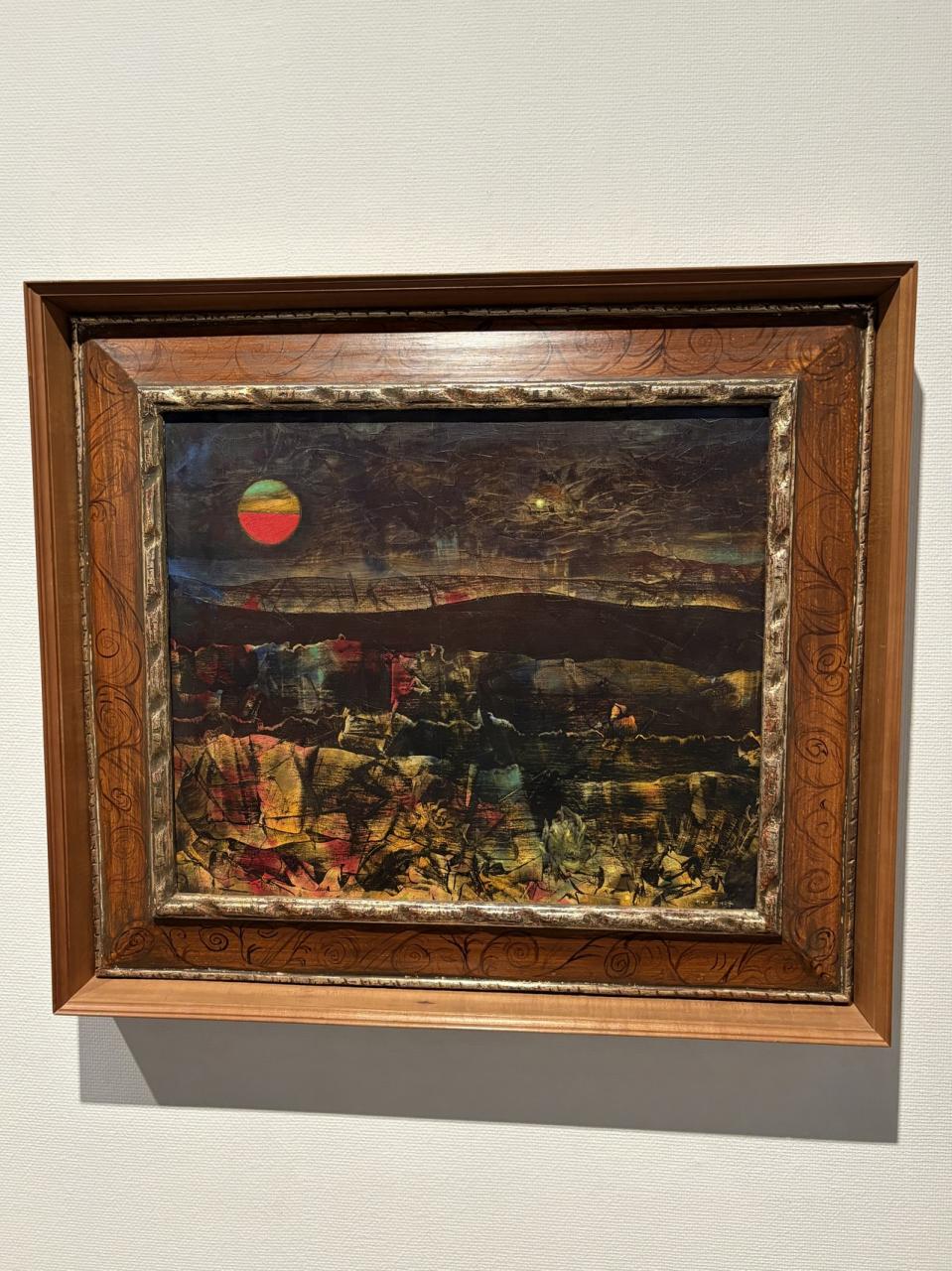 Spaces devoid of trees, birds, or other life forms, with a moon in vivid hues floating above them, are a signature motif in Ernst's works. A quiet and mysterious atmosphere pervades this painting. It seems as if something is about to happen, or has just happened, and the scene acts on the viewer's imagination in various ways.