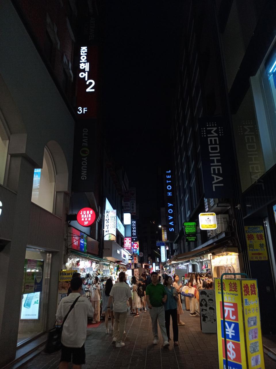 明洞に移動します。時刻は19時過ぎです。山からソウルタワーが見えます。