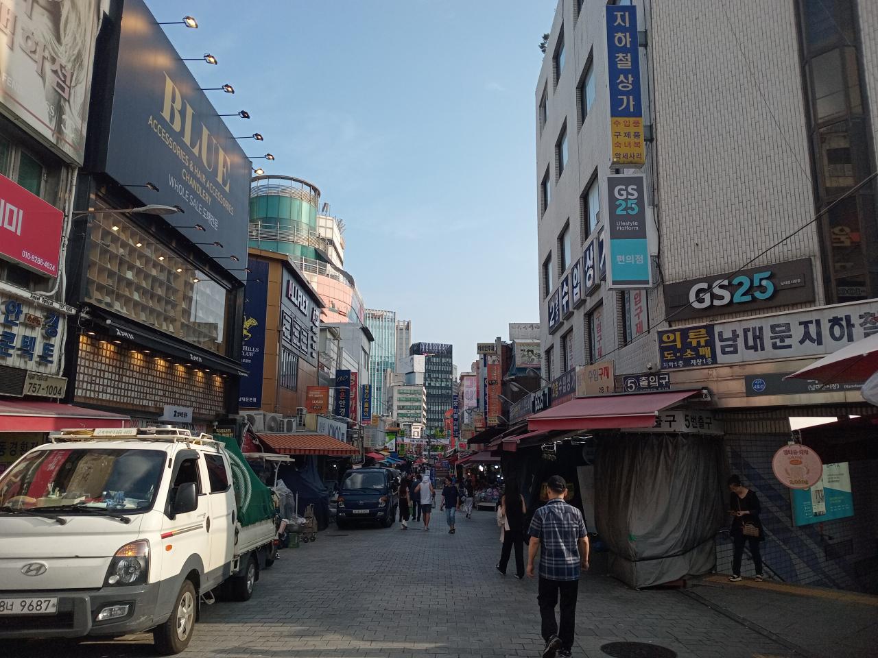 朝8時頃ホテルをチェックアウトして、南大門市場まで歩きます。今日も絶好の晴天ですね。ソウルの8月は東京以上に雨が多いようですが、3日間ほぼ晴天です。その分暑いですが。 -