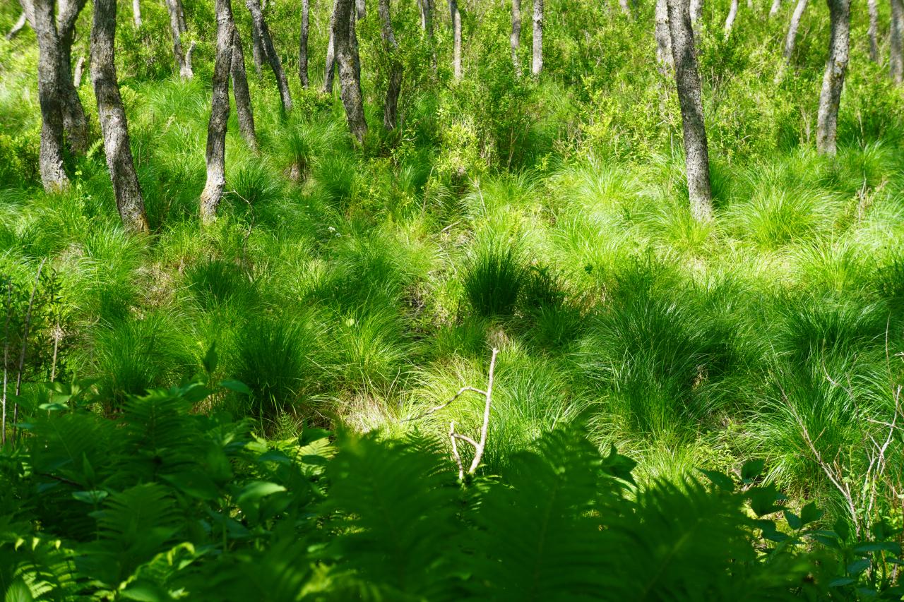「ヤチボウズ(谷地坊主、野地坊主)」はスゲ属の植物が盛り上がって作る株です。通常枯れて倒れたスゲは微生物によって分解されますが、低温過湿の湿原では分解されることなく枯れたスゲが残ります。冬季に凍結することで持ち上げられた株の周りの土は春の雪解け水で侵食され、株のみが盛り上がった状態となる。そしてこの株から再び新しい葉や茎が生育して巨大化していきます。この季節はただの草むらに見えますが、草の部分が枯れる季節になると不思議な姿を現します。