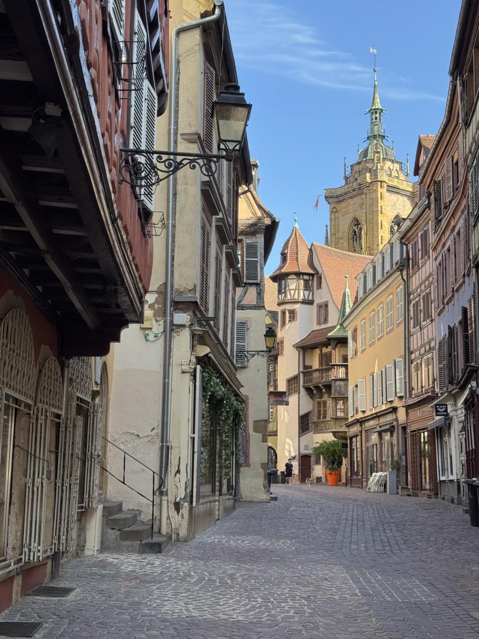 隣はドイツ風の建物が立っているんですけどね。教会の前には、フランス国旗・ドイツ国旗・EUの旗と3つ並んでいました。やはりこの辺がドイツからとても近いことが感じられる風景です。