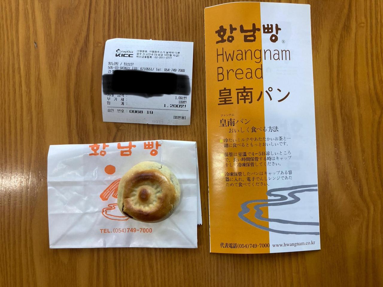 大陸苑を通り過ぎたところにある皇南パンのお店に行きました。ここは製造直売所で、1個だけでも売ってくれました。後ろでは、このお菓子を作っていました。あんこを薄皮でくるんだもので、パンというよりは日本の饅頭です。きんつばのような触感でした。1個1200ウォン(128円)でした。1個でも買えるかと聞くと、すぐ食べるのならちょっと待ってといった感じで、後ろの製造現場から出来立てを持ってきてくれました。お店で食べれるスペースがありました。熱かったですが美味しかったです。なお、イートインのスペースにはお茶はありませんが、水は飲めました。