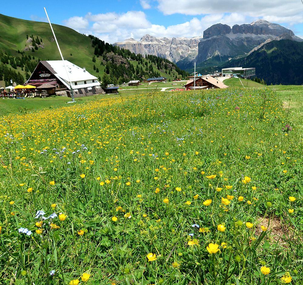 アルバには、27日に乗ったCol dei Rossiに登るゴンドラに加えて、反対方向のCiampacまで登る大型テレキャビンもある。フォートラベルのメンバーの旅行記でここできれいなトロリウスの花の群生が見れることを知リ、翌日(28日)に、ポルドイ峠に上がった後に、再びアルバまで車で来て、Ciampacを訪れることにした。花園は冬はスキーゲレンデになるが、Ciampacからテレキャビン下駅までのスロープはかなりの急斜面で、上級者向きのように思われた。