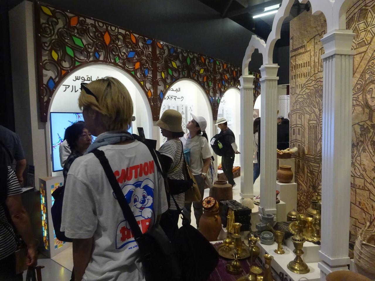 大阪ヘルスケアパビリオン前の「物質循環の仕組み」、関西パビリオンの三重バザール、カタール館前の民族音楽演奏を聴きます。