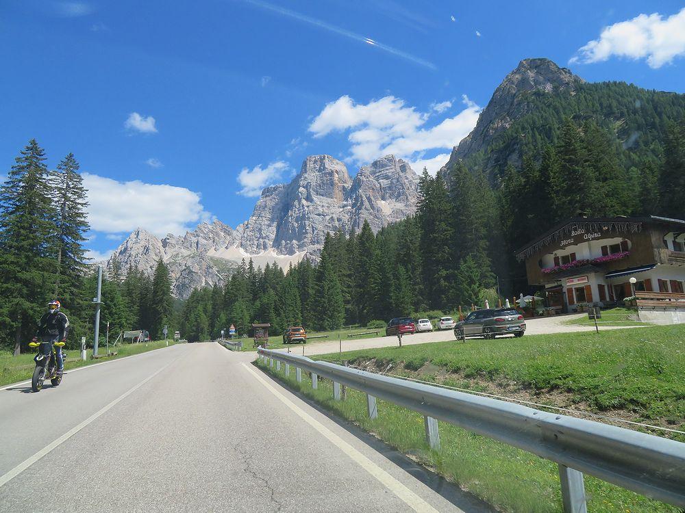 ロッカ・ピエトーレからしばらく走ったところ(カプリ―レ)で、左に分岐してSP20を走る。写真は分岐直前に撮影。チベッタが覆いかぶさるように聳えていた。チベッタの標高は3220m、ロッカ・ピエトーレの標高は1143mなので、2000m以上の標高差だ。2013年にもまったく同じ位置からチベッタを撮影していた。