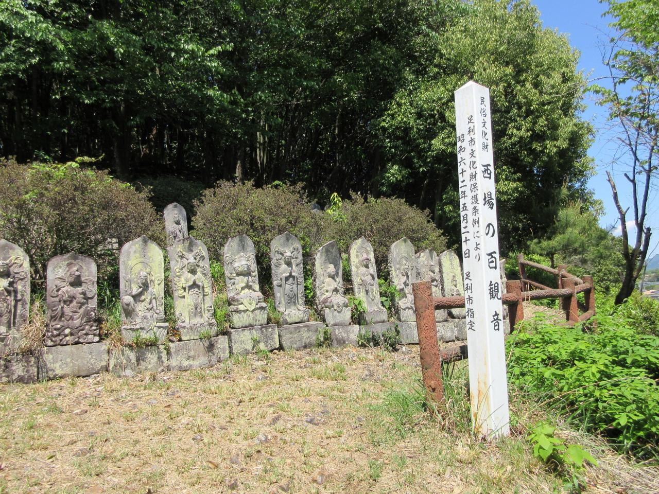 西場町地内、通称「観音山」南麓斜面の勧行寺(かんぎょうじ)跡に、石造の観世音菩薩像が100体、南面して3段に整然と並んでいます。