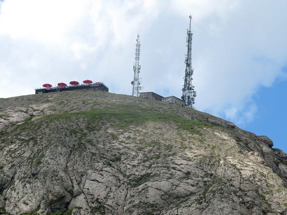 上記の道の最後まで来てから、目の前のサッソルンゴを撮影(上)。下は、上の写真の中央やや右を拡大。岩壁の中に有名な二人乗りゴンドラリフトの頂上駅が見えていた。
