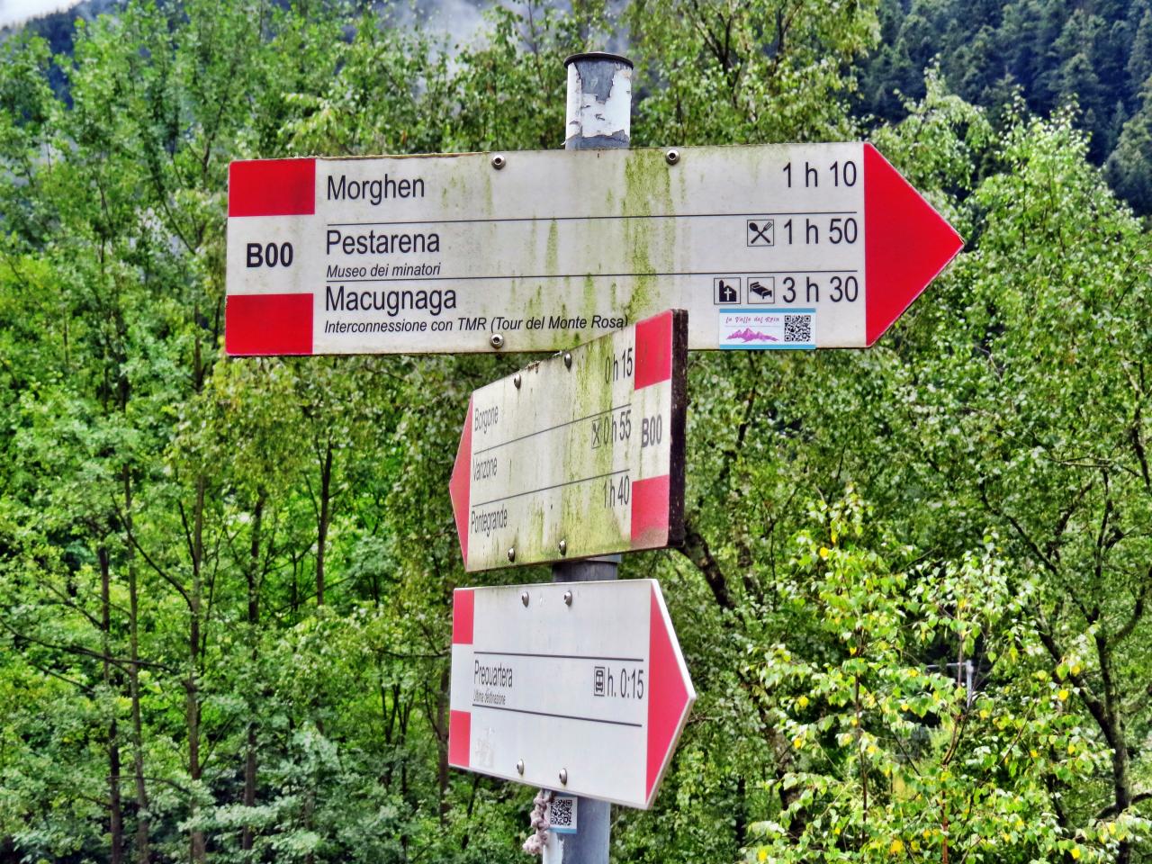 アパートを出発して約1時間。Ponte sull'Anzaに到着。ここでベルヴェデーレ方面のコースと道を分ける。我が家は上から3枚目の標識の2段目・ALPE ROFFEL STAFFELに向かう。この先も30分ほどはアンザ川の護岸工事でトラックと重機がうるさく、ハイキング気分になれない。