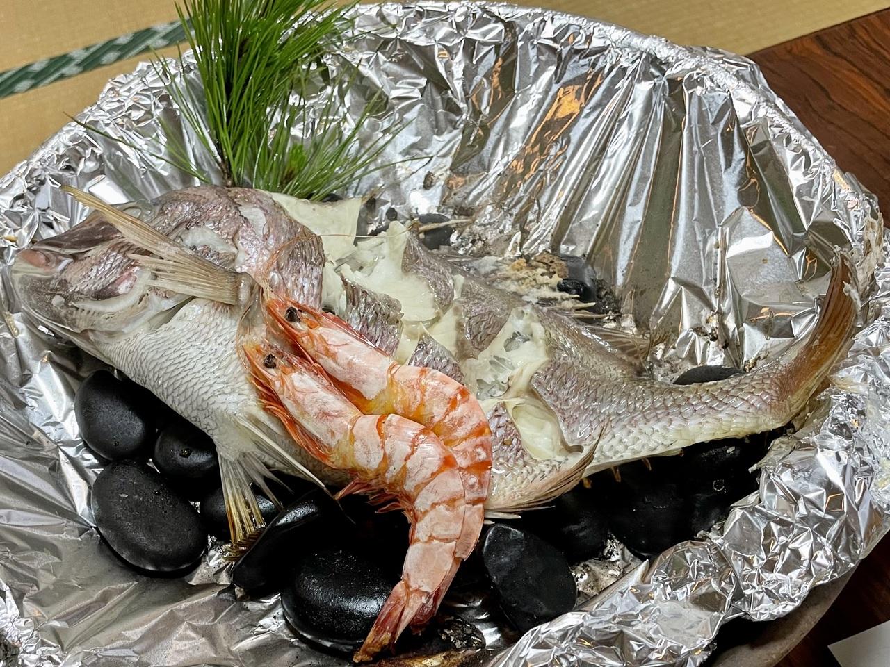 鯛とエビの焙烙焼き、自家製ポン酢で