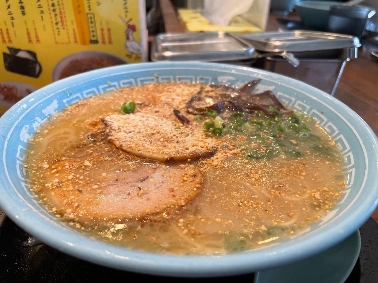 ラーメンアップ。熊本らしいニンニクがたっぷりと掛かっています。