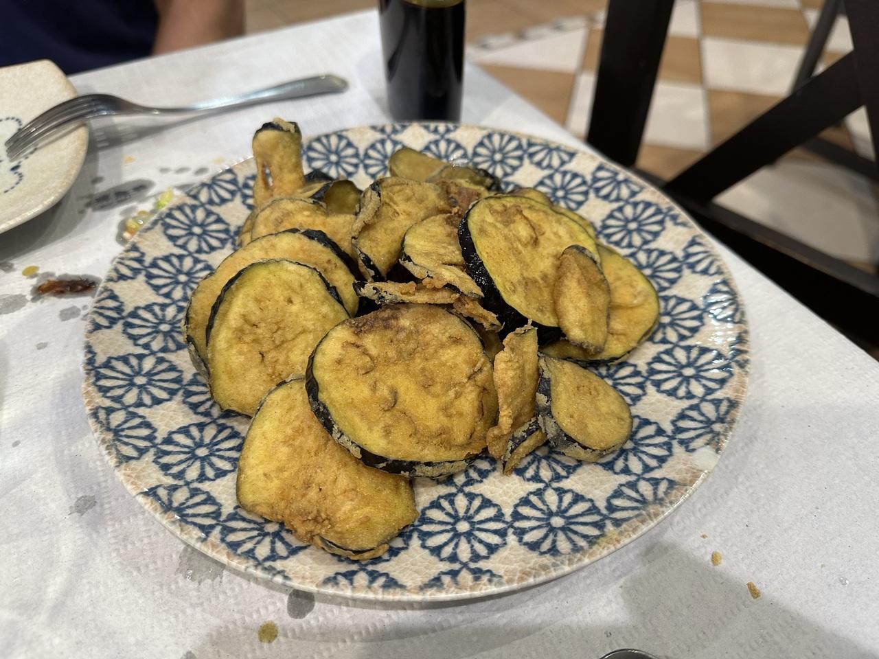 Berenjenas。茄子の天ぷらに甘いバルサミコソース。