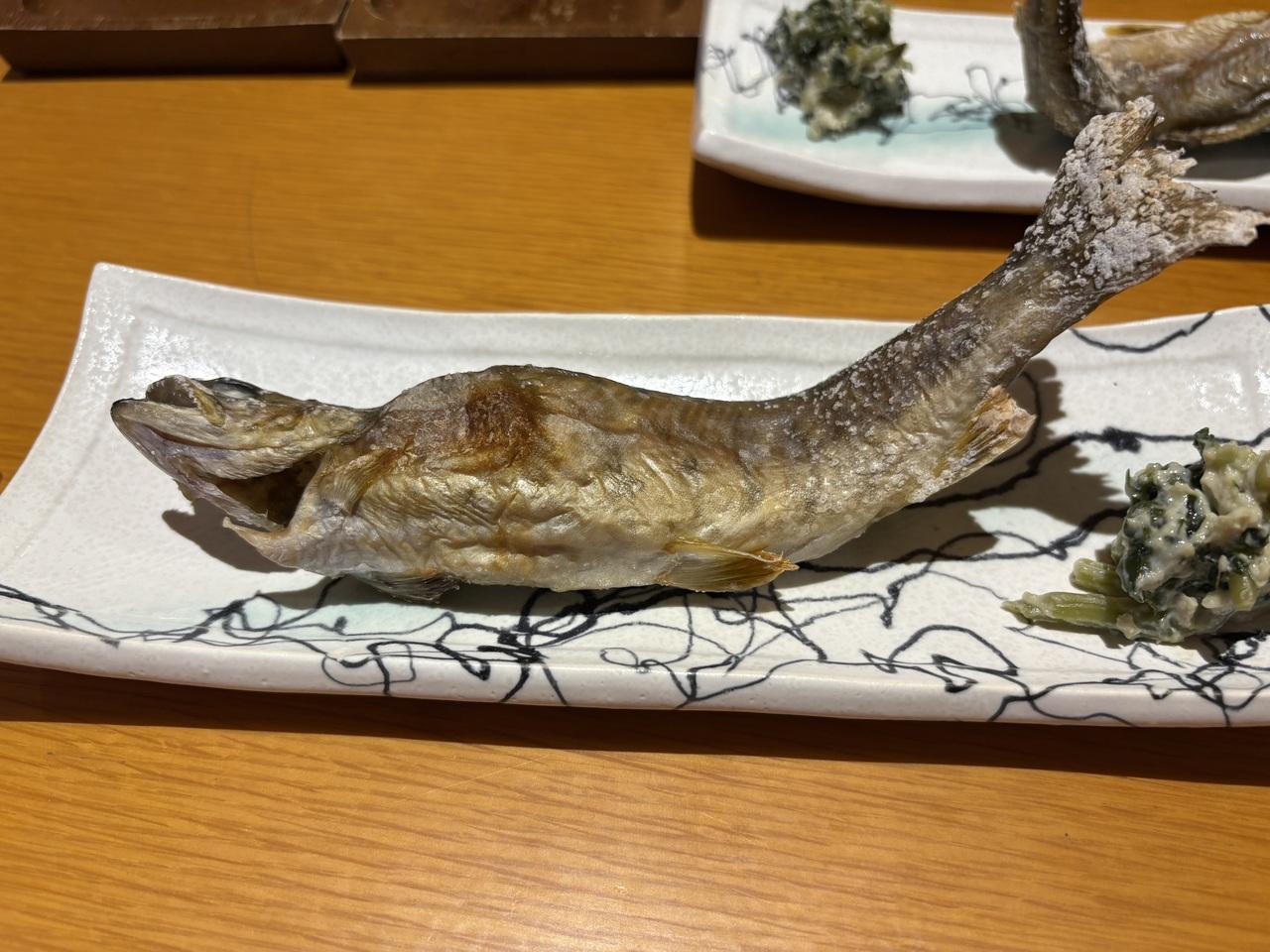 五箇山荘の夕食。イワナの塩焼き